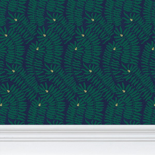 Deep blue and green fynbos wallpaper with stylised cone flowers. A bold, handcrafted wallpaper inspired by the textures of lino print techniques. Stylised fynbos leaves and cone flowers in deep green and navy tones are accented with touches of yellow, creating a vibrant yet balanced composition. The design’s layered, hand-cut aesthetic is perfect for statement walls or creative interiors.