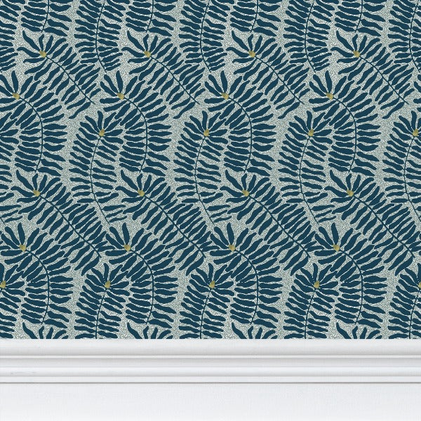 Blue and teal fynbos wallpaper with stylised cone flowers. A bold, handcrafted wallpaper inspired by the textures of lino print techniques. Stylised fynbos leaves and cone flowers in deep blue and teal tones are accented with touches of yellow, creating a vibrant yet balanced composition. The design’s layered, hand-cut aesthetic is perfect for statement walls or creative interiors.