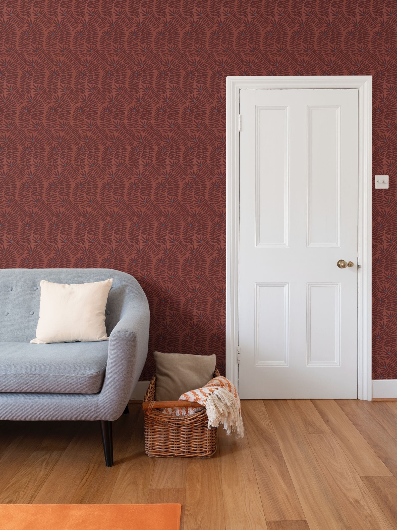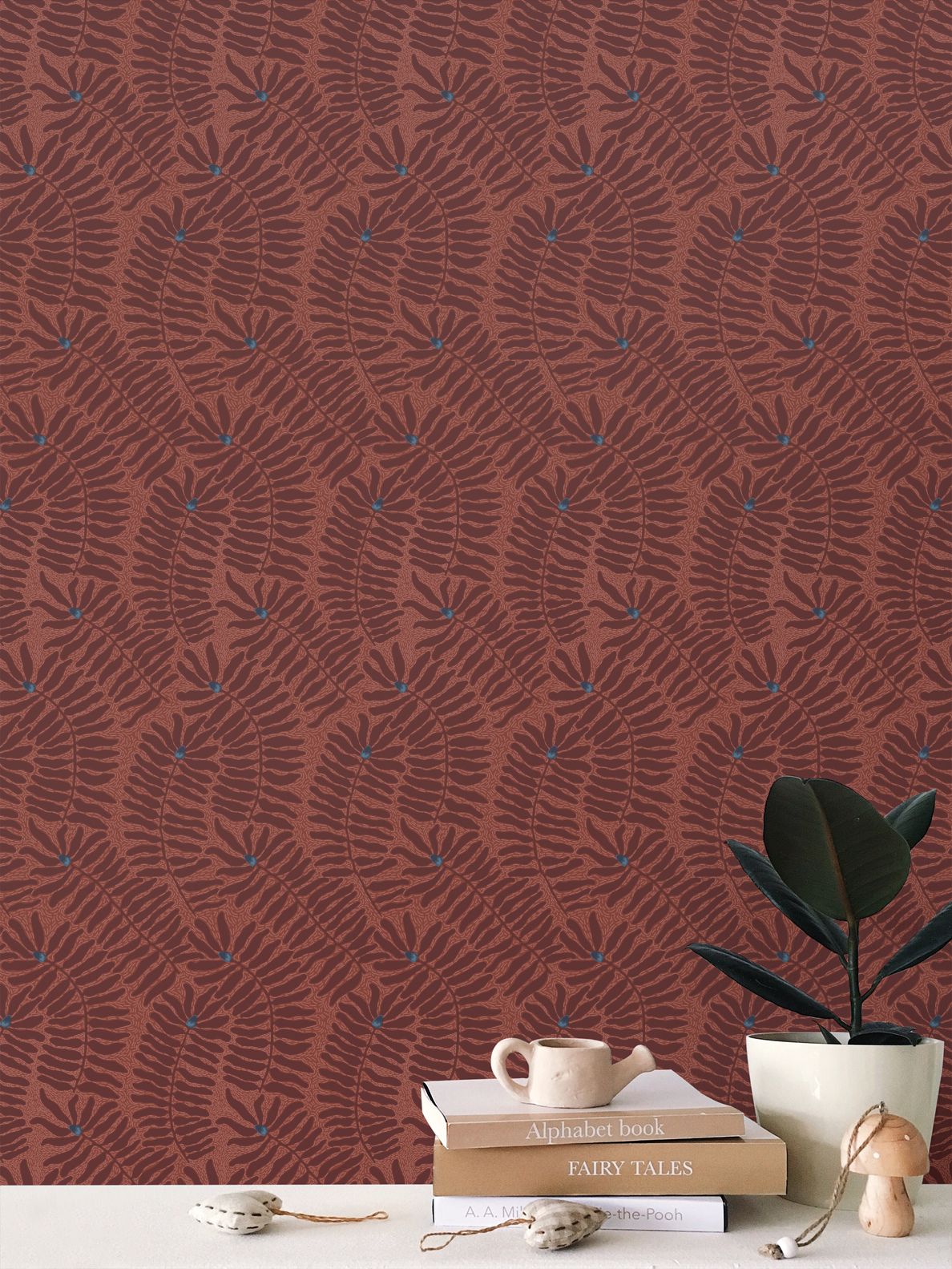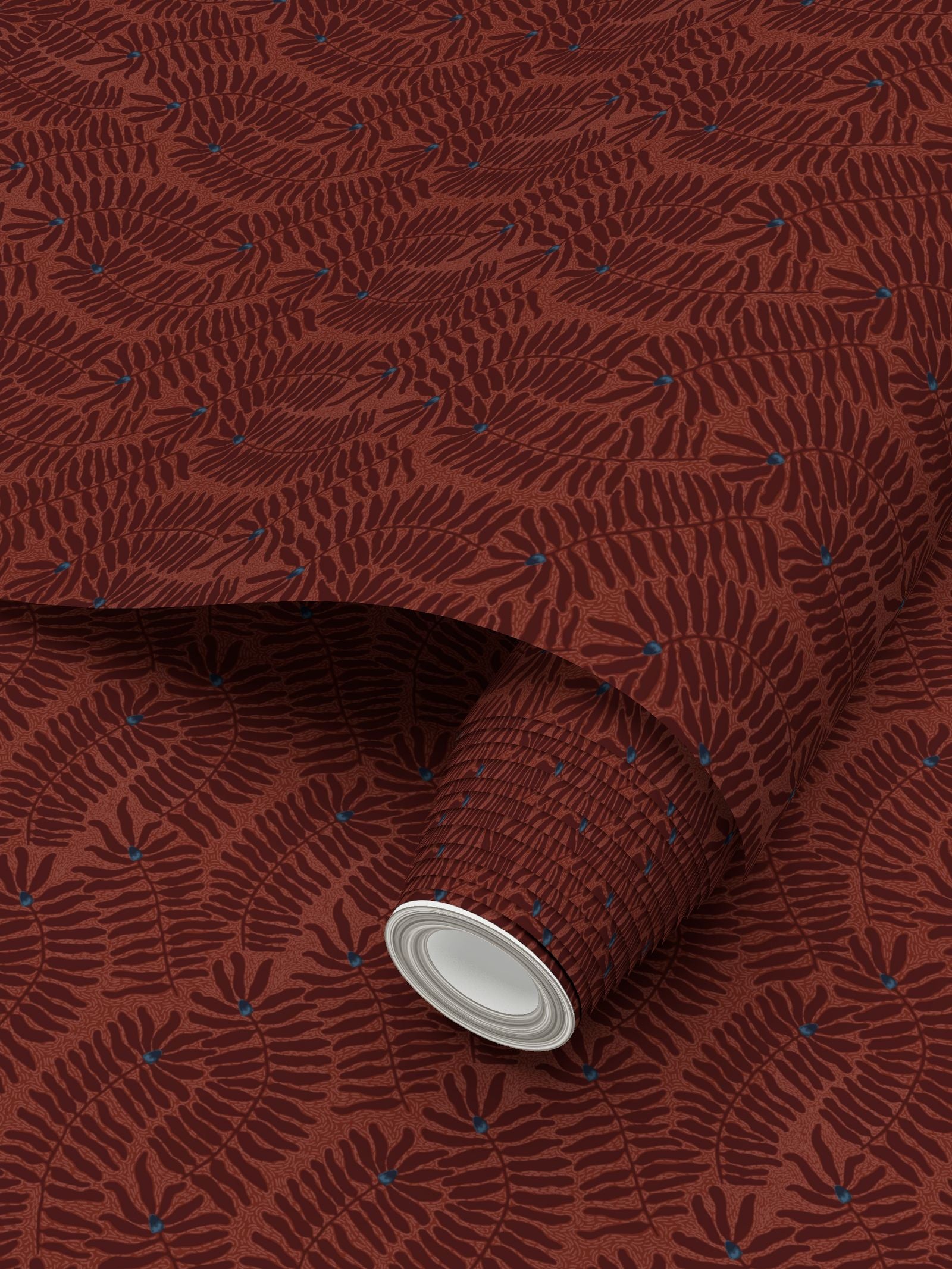 Blue and teal fynbos wallpaper with stylised cone flowers. A bold, handcrafted wallpaper inspired by the textures of lino print techniques. Stylised fynbos leaves and cone flowers in deep burgundy and terracotta tones are accented with touches of teal, creating a vibrant yet balanced composition. The design’s layered, hand-cut aesthetic is perfect for statement walls or creative interiors.